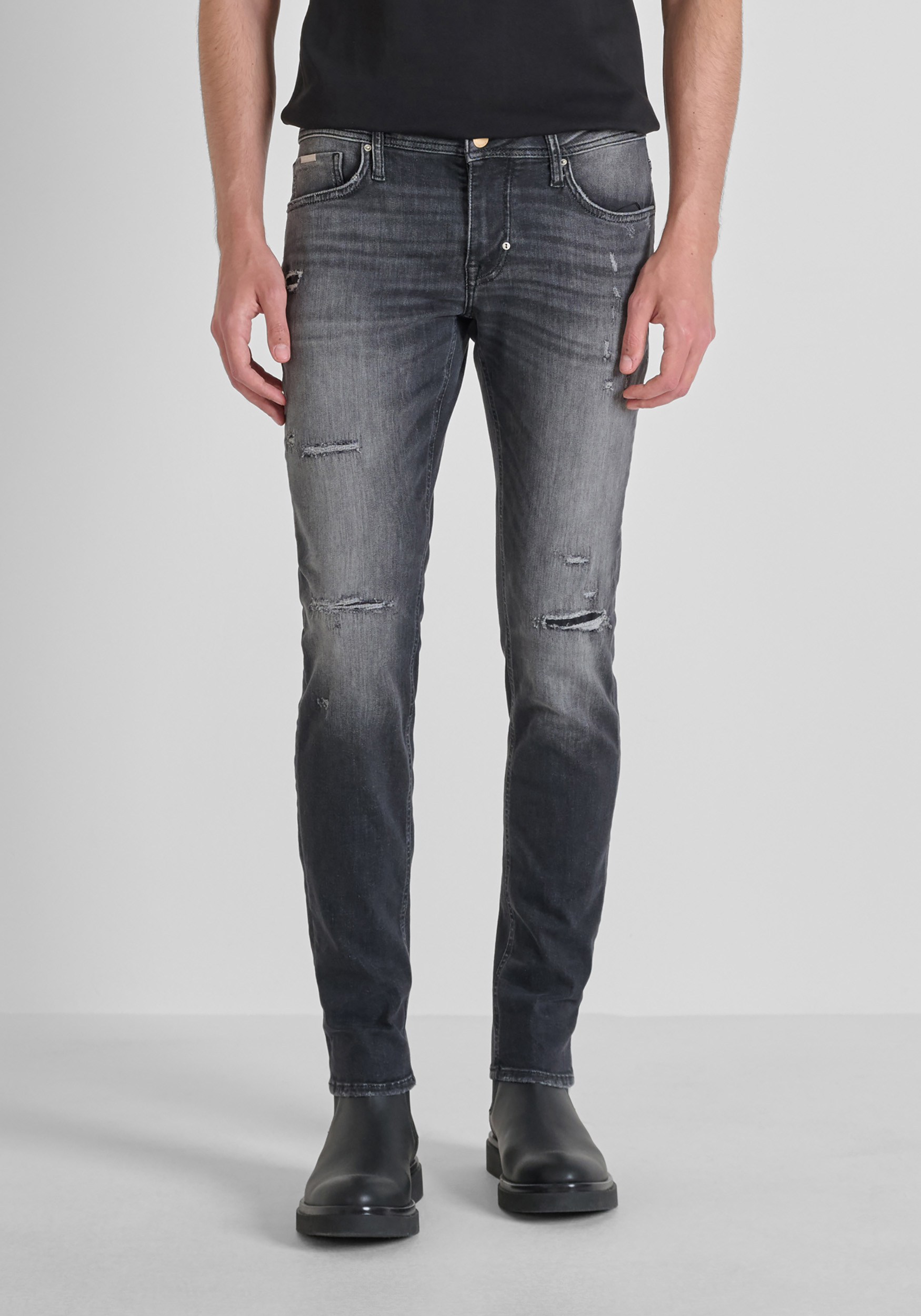 VAQUEROS TAPERED FIT "OZZY" EN DENIM NEGRO CON ACABADO RASGADO